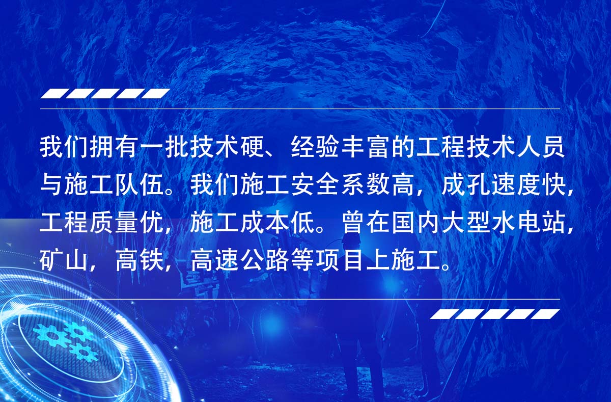 淮北市勤拓礦山工程有限公司是一家從事多年反井鉆機(jī)施工的服務(wù)生產(chǎn)型公司,公司目前有十幾臺(tái)鉆機(jī)設(shè)備,ZFY120/30/150型反井(天井)鉆機(jī)5臺(tái),ZFY1.8/40/250型反井(天井)鉆機(jī)4臺(tái),ZFY2.5/70/200型反井(天井)鉆機(jī)2臺(tái),ZFY3.0/120/400型反井鉆機(jī)1臺(tái),ZFY3.5/120/400型反井(天井)鉆機(jī)1臺(tái),可承接深度0-300米,成孔直,0.9~4米.1.2~3米的各種豎井、井下煤倉、溜煤眼、通風(fēng)井、調(diào)壓井、電纜井、泄水井等。我們擁有一批技術(shù)硬、經(jīng)驗(yàn)豐富的工程技術(shù)人員與施工隊(duì)伍。我們施工安全系數(shù)高,成孔速度快,工程質(zhì)量?jī)?yōu),施工成本低。曾在國(guó)內(nèi)大型水電站,礦山,高鐵,高速公路等項(xiàng)目上施工。